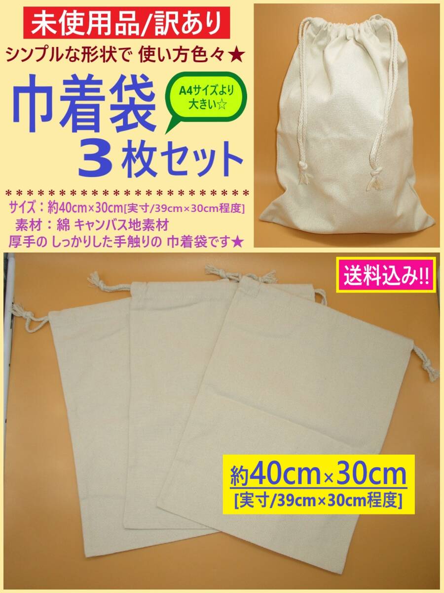 - 訳あり 未使用 無地 キャンバス地 巾着 袋 3枚 C 40×30 コットン 綿 布 バッグ 厚手 小分け ラッピング 材料 アイボリー 海外製 在庫処分