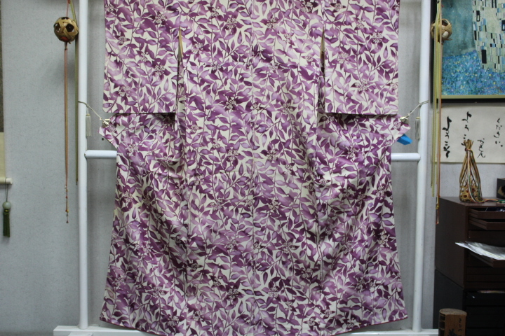- きもの今昔7959 小紋のきもの 広衿袷仕立て 正絹一越ちりめん地木の葉柄小紋 胴裏完全に酸化状態