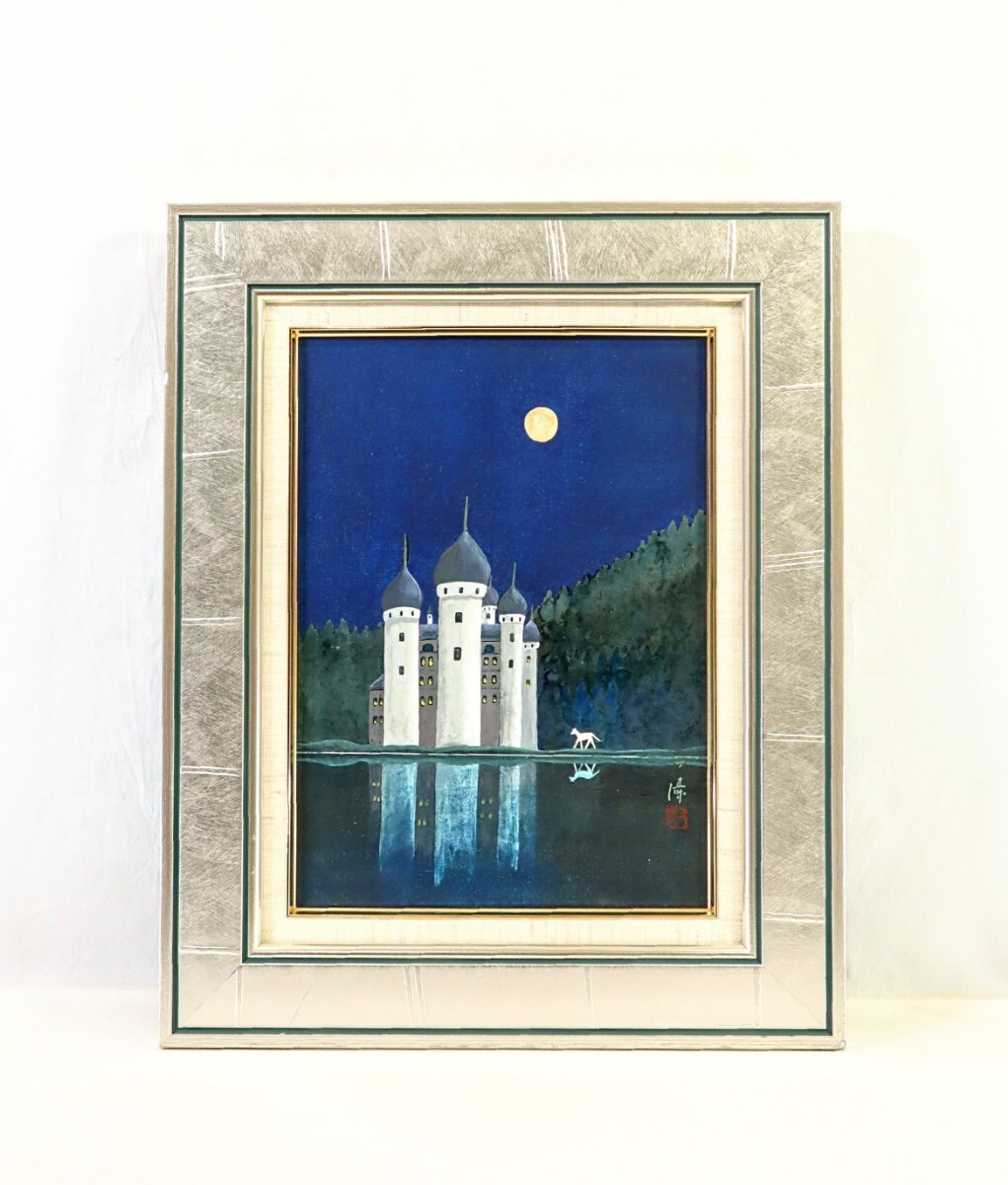 - 真作 深田一濤 日本画「古城深夢」画寸 4号 大阪府出身 無所属 深田直城に師事 満月夜の湖畔に建つ白亜の城と翔る白馬で幻想的 一涛 10115