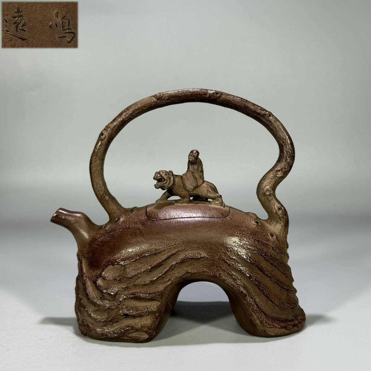 - 古陶芸 紫砂壷 清時代 【鳴遠】 在銘 「伏虎樹根提梁壺」 紫泥 煎茶 急須 茶道具 唐物 時代物 茶器 容量300cc LT-241283