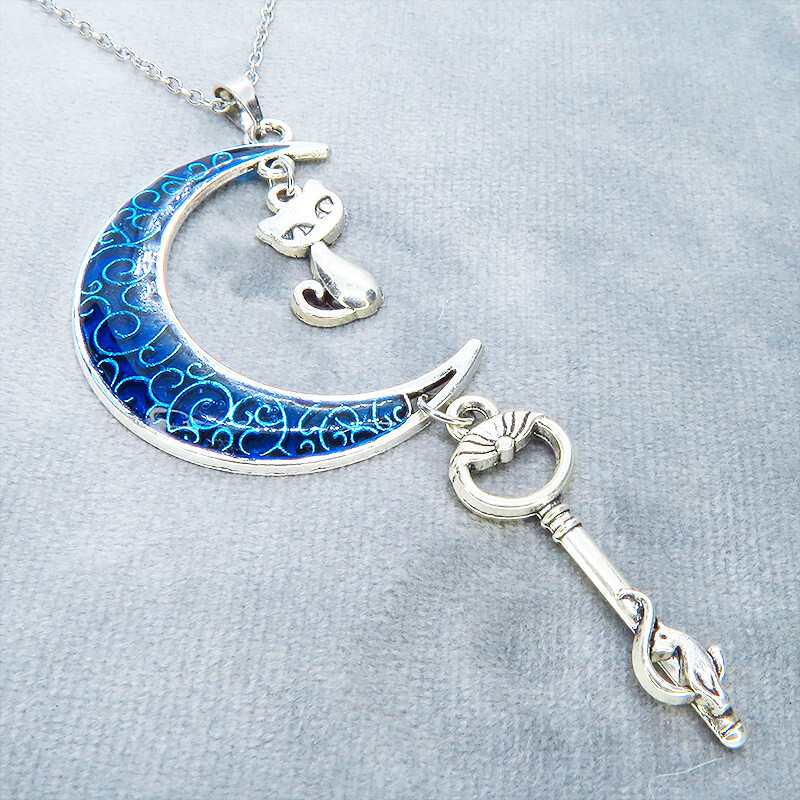 - アンティークシルバー ブルームーン マリンブルーの三日月に猫と鍵を吊り下げたネックレス 長さ調整可