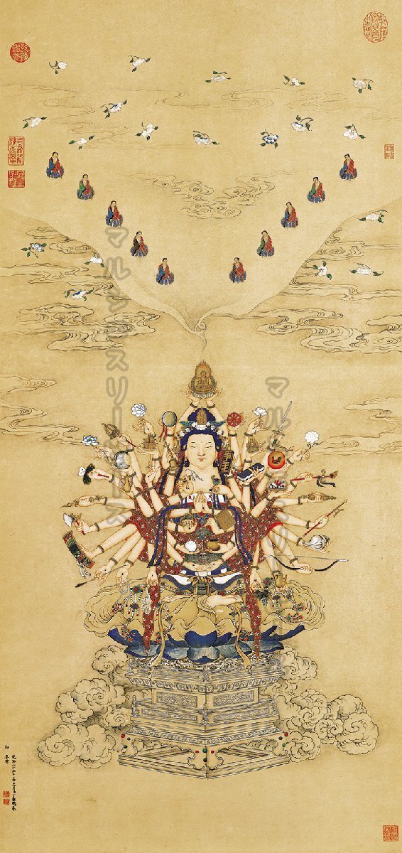 - 蓮座 清 丁観鵬 宝相 千手観音 観音図 観音大士像 観音像 仏像 観世音菩薩 仏画 菩薩像 縦幅 仏教美術 宣紙画芯 掛け物 未表装