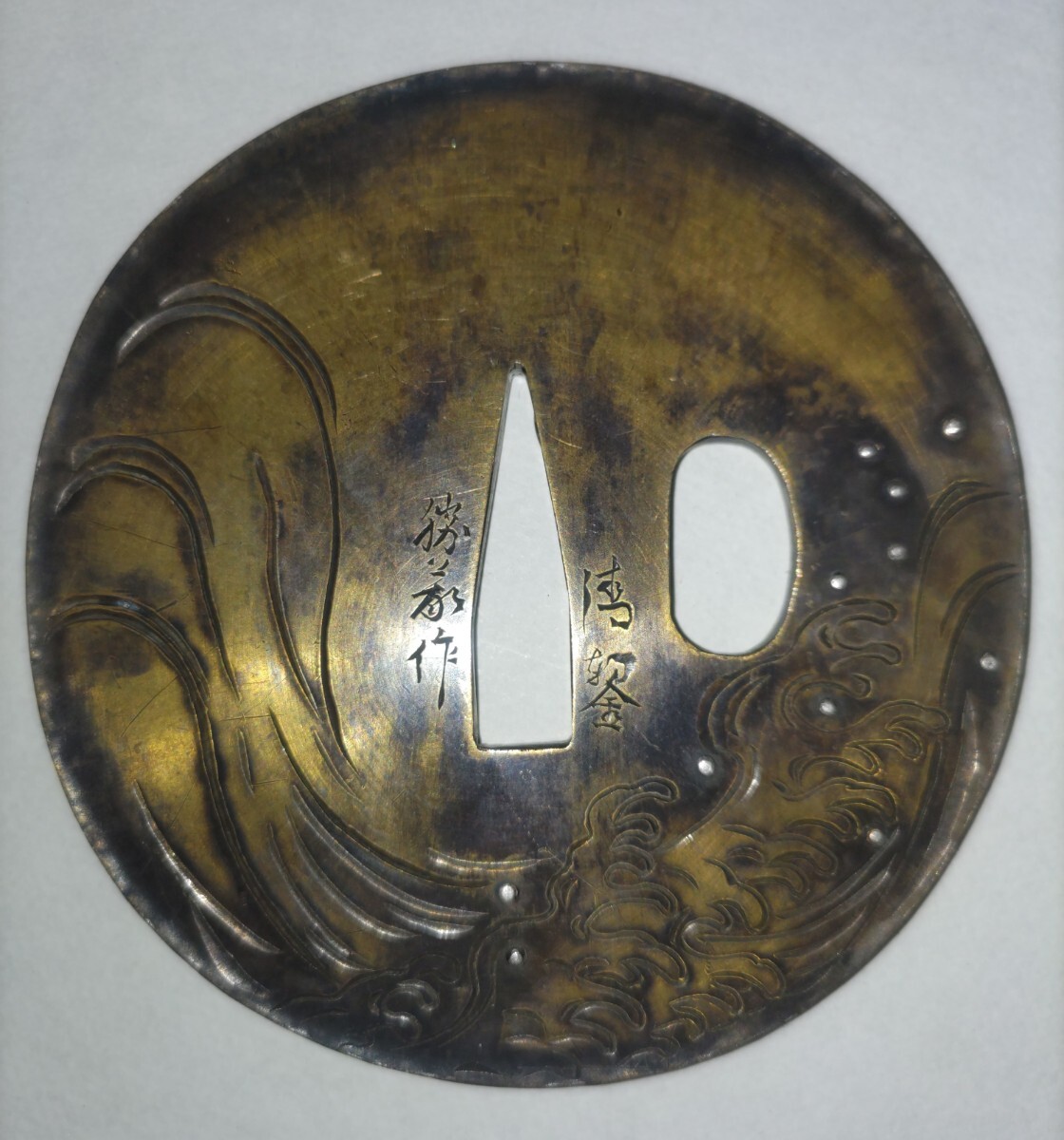 - 江戸時代〜明治時代 金工 波飛沫 銀象嵌 真鍮 在銘 大鍔 サイズ(約)縦横 8センチ 7.8センチ 厚み 3.5ミリ 武具 刀装具 鐔