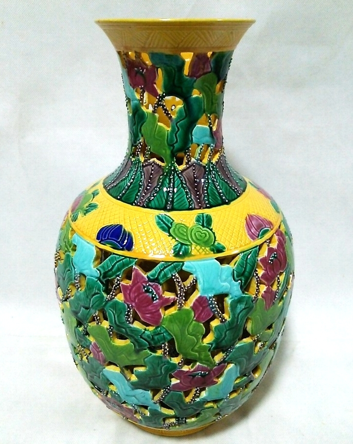 - ★【一美堂】★大清乾隆年製銘★黄交趾に見事な透かし『花瓶(壺)』★名品★箱付★