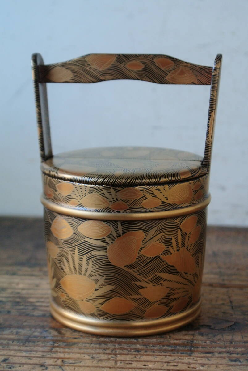 時代 黒漆内梨地 海松貝尽金蒔絵 手桶茶器 割蓋 仕覆付 合せ箱。