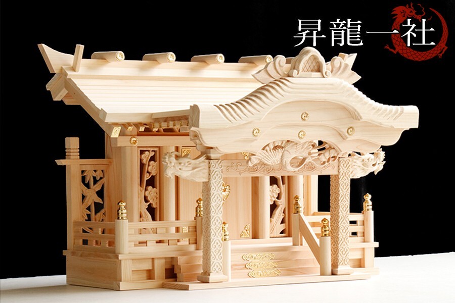 - 神棚 一社 単品 昇龍大社 / 入母屋 大型 美彫り ■ 高級ひのき製 限定仕様 真鍮の彩りと「阿吽の龍」