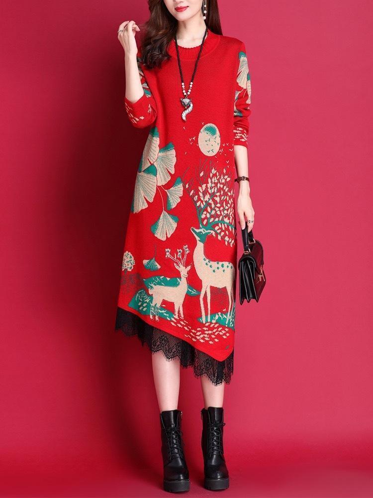 - 紅ニットネイチャー柄★Lサイズ ひざ丈 ニットワンピースおしゃれ