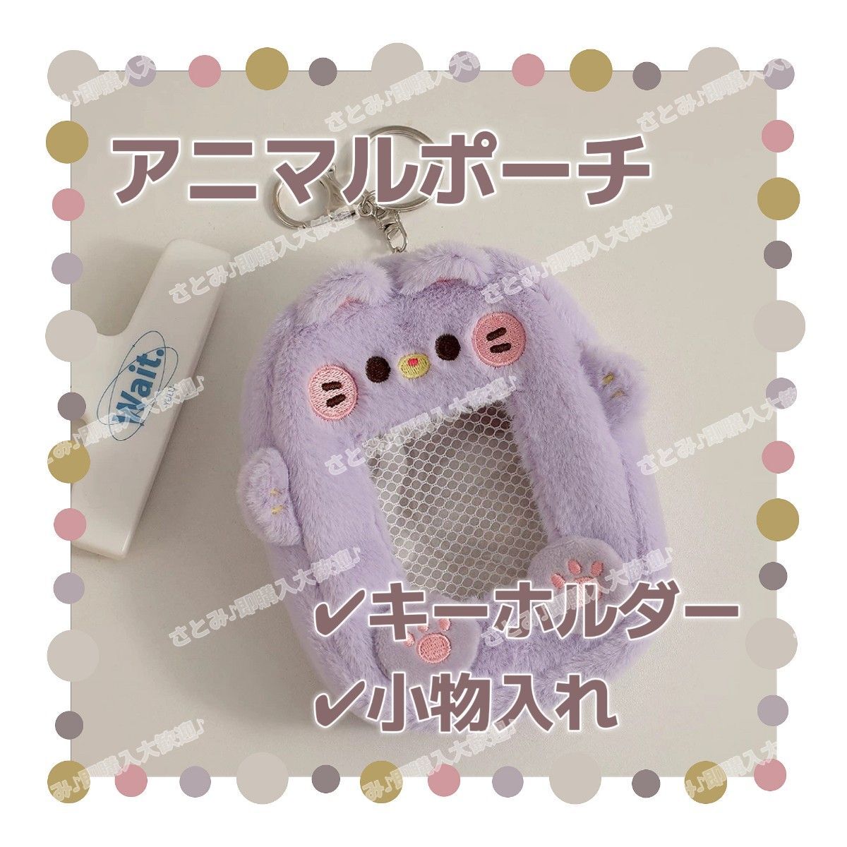 - アニマル ポーチ 小物入れ トレカ チェキ キーホルダー ふわふわ クマ パープル