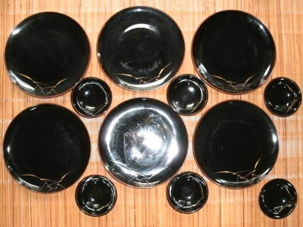 - '芦あしの葉 '茶淵金葉 の「天ぷら皿」と「天つゆ器」を6セットで ( 黒 直径24cm 中皿 傷や擦れあり)