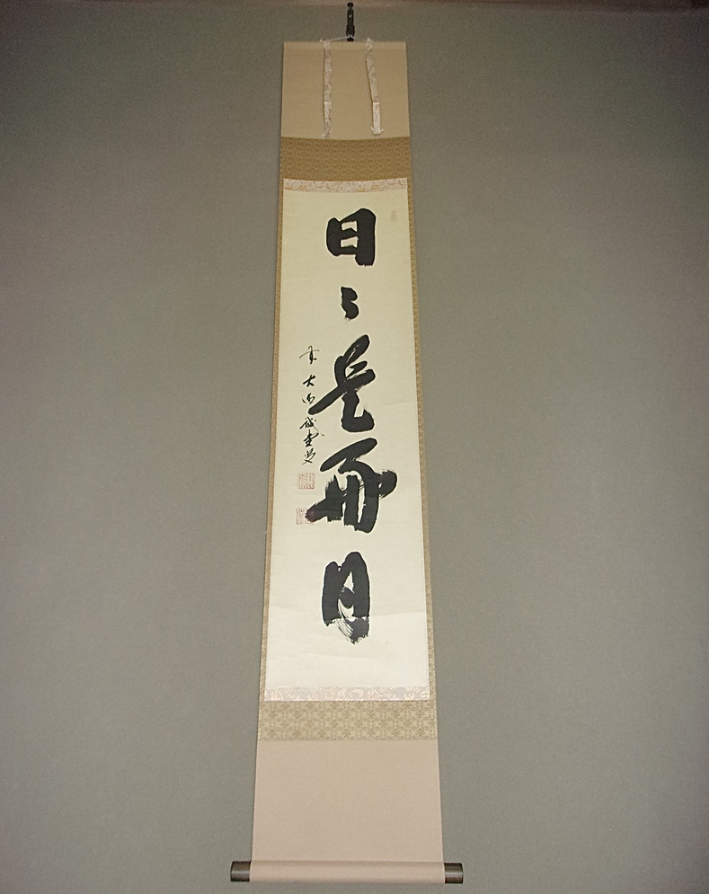 - 掛け軸 大徳寺 515菅長 藤井誡堂 藤井誠堂 筆 日々是好日 一行書 前大徳 掛軸 共箱 木箱 茶掛け 茶道具 書画肉 筆紙本掛軸 (昭和時代購入