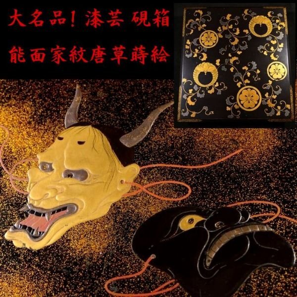 > 【 恵 #1468】 大名品! 極上の能面家紋唐草蒔絵 金蒔絵 梨地 硯箱 大変見事な蒔絵の一品です 検:漆芸/漆器/時代物/書道/書道具