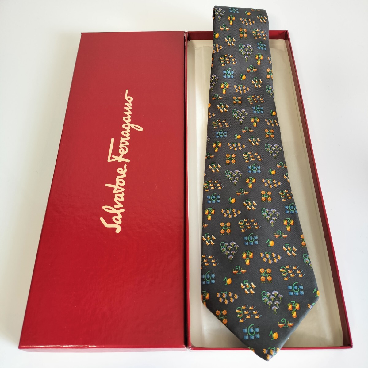- Salvatore Ferragamo(サルヴァトーレフェラガモ)グレー魚鳥果実デザインネクタイ