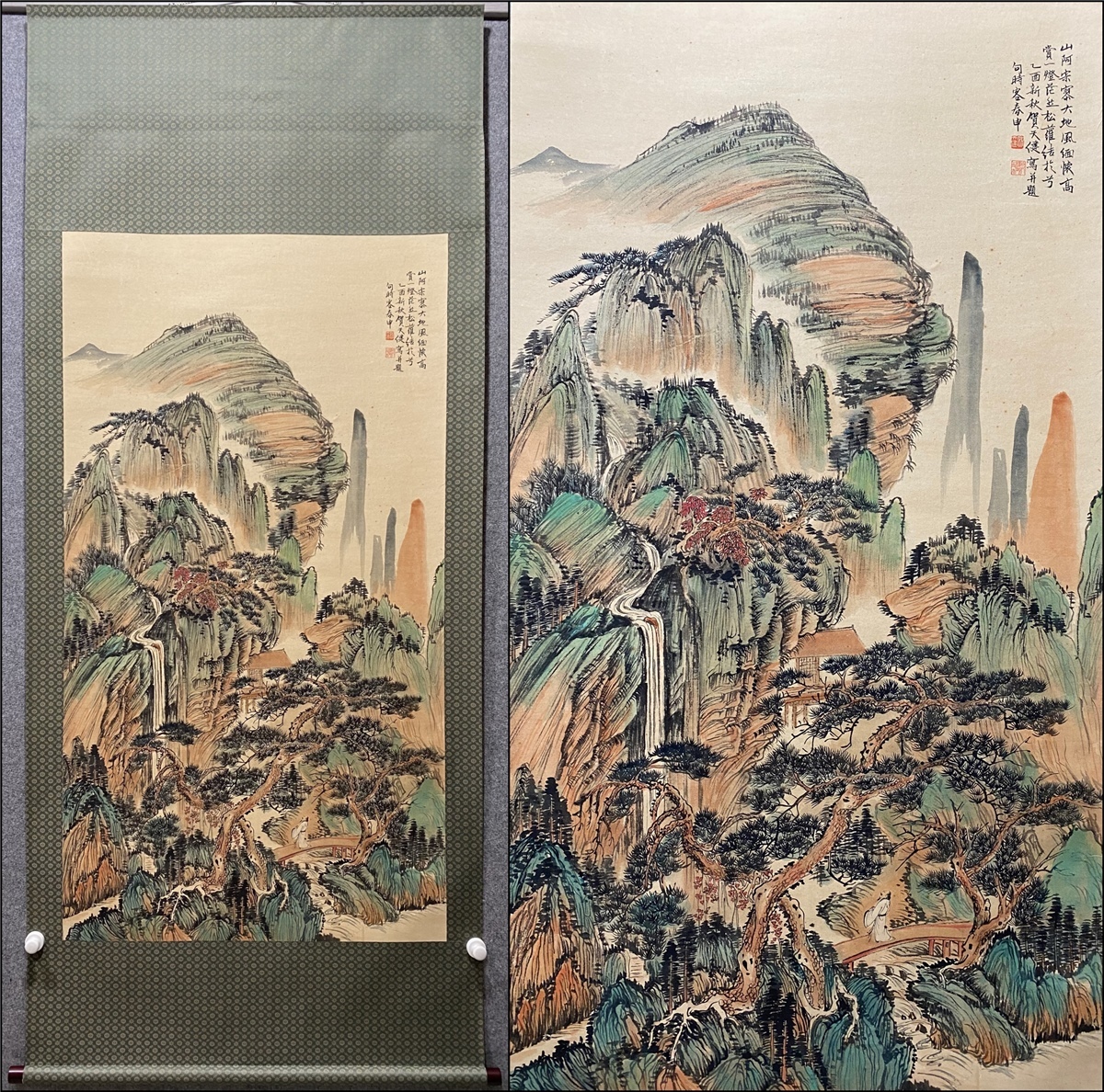 > 古美術 掛け軸 中国・近現代 「賀天建書」 紙本 【秋山松壑図】 立軸 書道 巻き物 肉筆保証 唐物 古画 画心125x68cm LT-250147