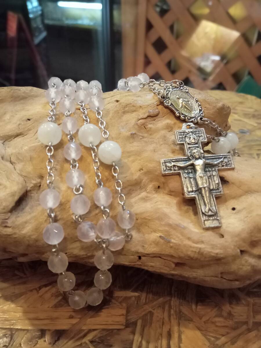 - ロザリオ,ピンクカルセドニー,ムーンストーン,ネックレス,聖ダミアーノ,マリア,キリスト,十字架,クロス