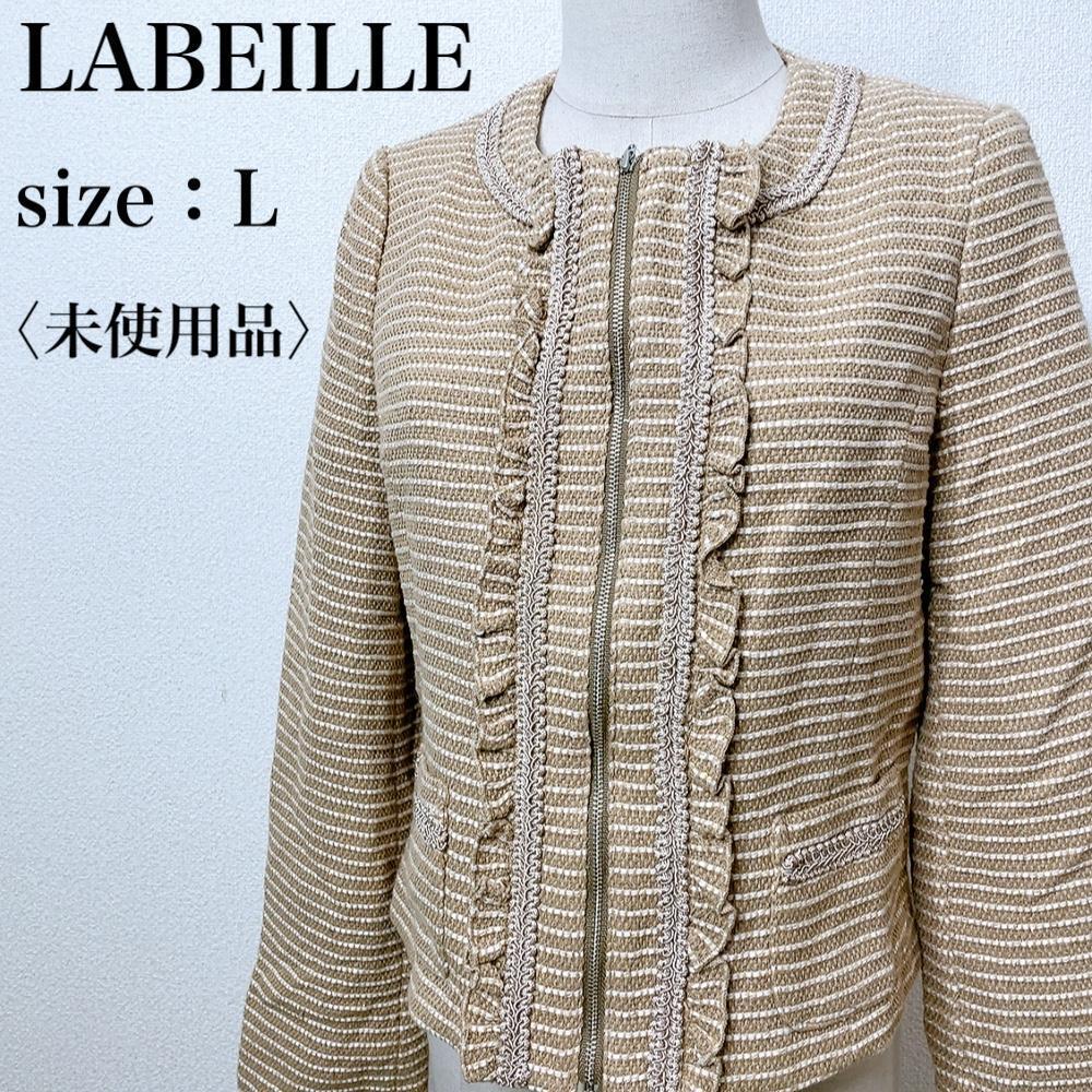 > 【未使用品】LABEILLE ラベイル 高級感 ジップアップノーカラージャケット フリル ボーダー エレガント カジュアル 羽織り ベージュ を07