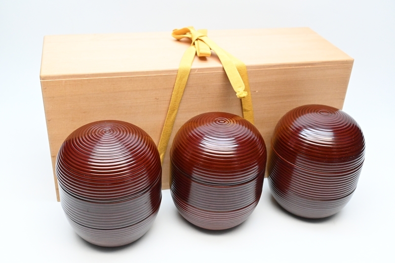 - 信玄弁当 ■ 筋目 弁当箱 三段 [ 溜塗内朱 蓋盃 ] 千筋 重箱 三客 ■ 天然木 木製 茶道具 会席 懐石 野弁当 木箱入り ■
