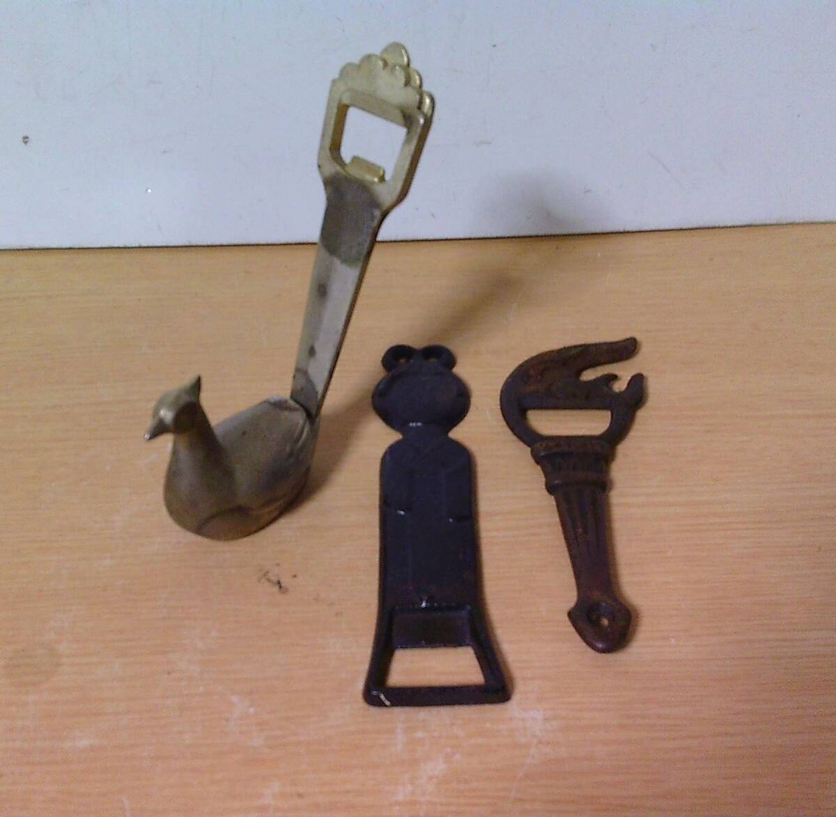> ■ く-444 栓抜き 計3個 こけし ´64聖火 フェニックス 中古 レトロ ※単品最大)長さ14.5cm 幅4.6cm 厚さ2.5cm 全重395g
