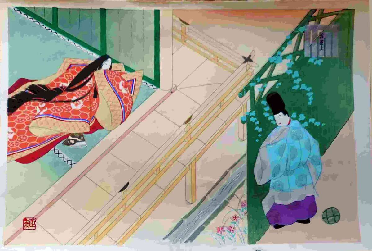 - f24121434〇彩色木版画1枚 源氏物語五十四帖 若菜上 海老名正夫原画 山田書院 昭和時代〇和本古書古文書