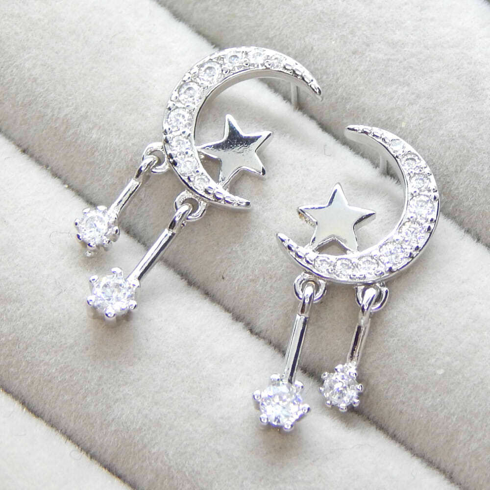 - 月と星 11連CZダイヤモンドピアス レディースアクセサリー プラチナ仕上 オススメ シルバー925 限定 極上の逸品 ジルコニア イヤリング化可
