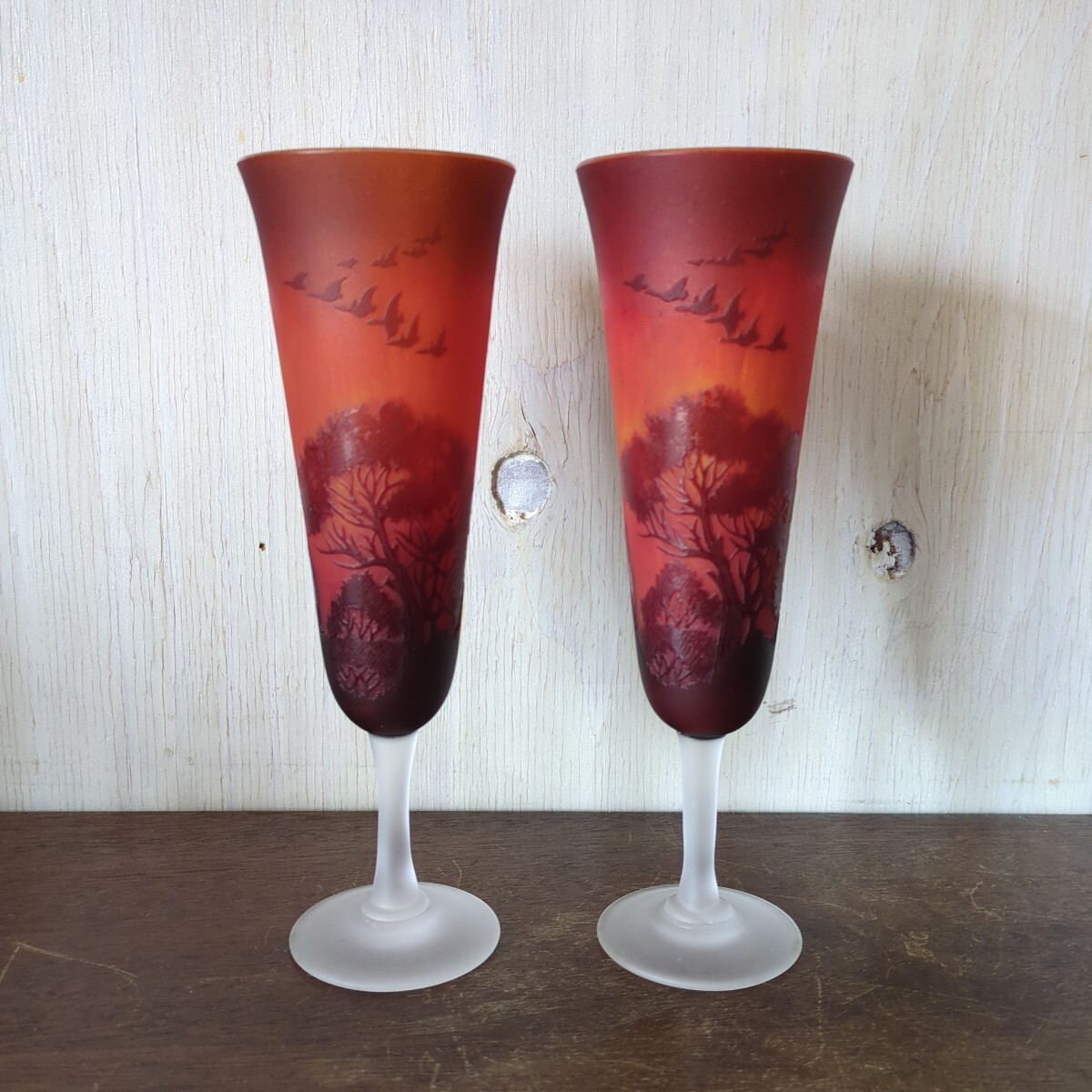 - 中野良広 色付き ガラス ワイングラス 酒器 ペア 2客 工芸ガラス 色被せ 森風景画 鳥