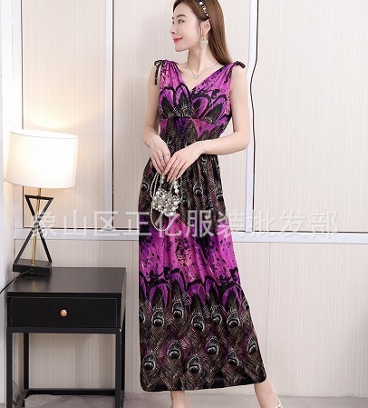 > リゾートドレス マキシワンピース ロングドレス エスニック ペイズリー ピーコックプリント(ブラック×パープル)ストレッチ 新品