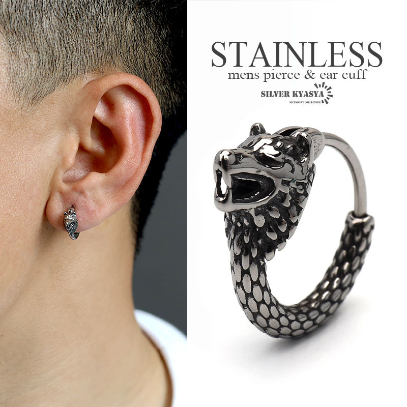 - ウルフ 狼 フープピアス ステンレス メンズ モチーフピアス シルバー アニマル 燻し風加工 金属アレルギー対応 片耳 1点