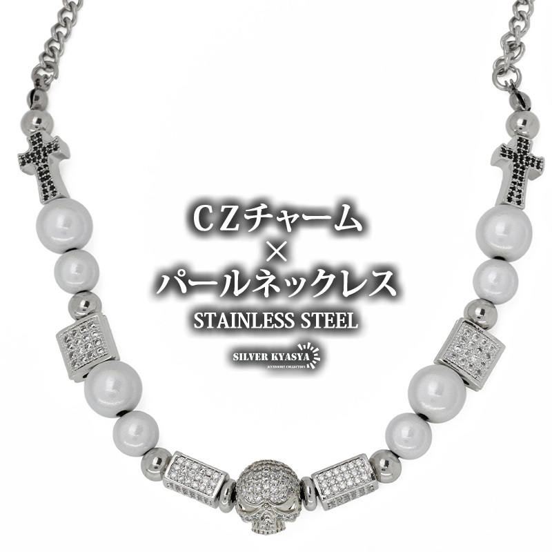 - パールネックレス メンズ シルバー ステンレス スカル パール チェーンネックレス 十字架 クロス CZ 金属アレルギー