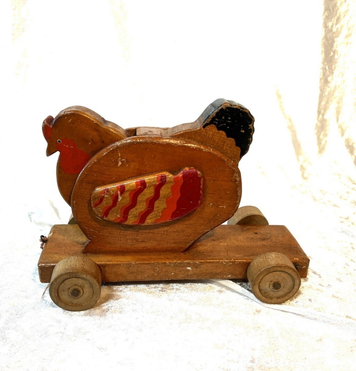 - 【雑貨・おもちゃ】にわとりの引き車 木製 カタカタ 昭和レトロ 古民具 玩具 ディスプレイ用品 インテリア用品 骨董品 アンティーク