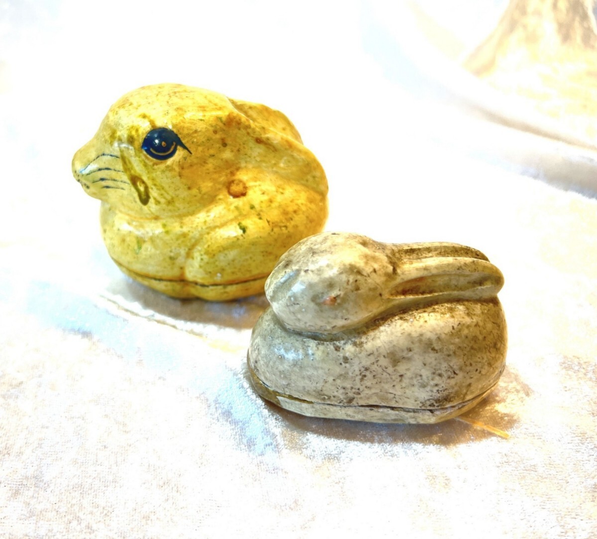 - 【雑貨・茶道具】ウサギの香合2個セット 陶器製と紙製 ペーパーマッシュ 小物入れ ディスプレイ用品 インテリア用品 骨董品 アンティーク