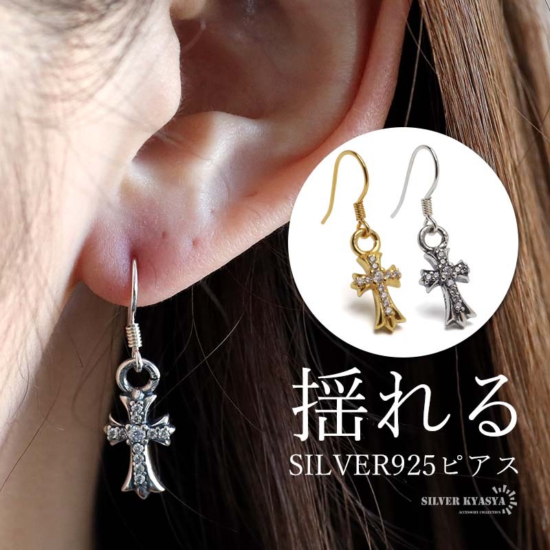 > (ゴールド) シルバー925 クロスピアス フックピアス ドロップピアス 揺れる 小ぶり 18kgp 十字架 片耳1点アレ対応