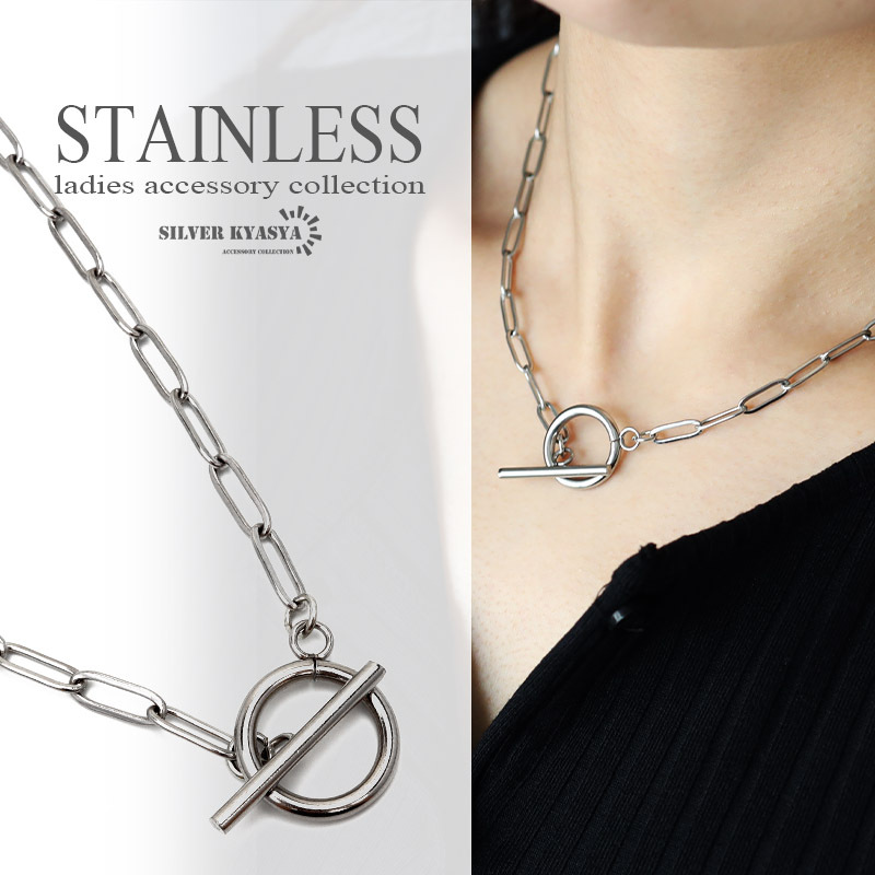 - (40cm) ステンレス チェーンネックレス レディース マンテル シルバー シンプル Tバー 金属アレルギー対応
