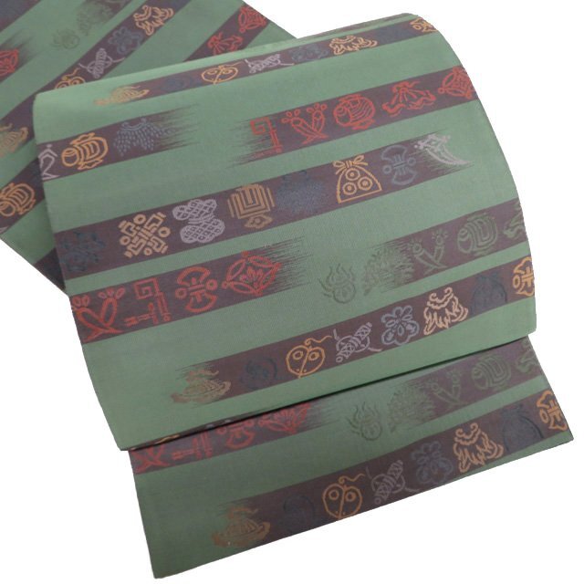 - 袋帯 中古 リサイクル 正絹 カジュアル 仕立て上がり 全通 つづれ織 宝尽くし文 老竹色 樺茶色 多色 きもの北條 A1145-10