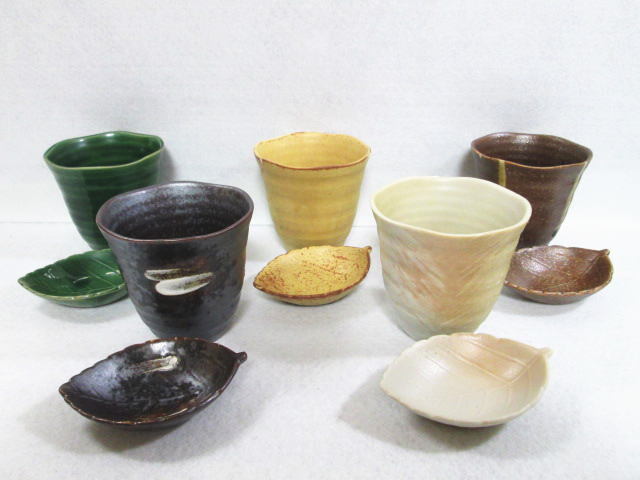 - 陶器製 湯呑 豆皿セット 5客 フリーカップ 湯み 葉っぱ 小皿 5種 5色 お揃い