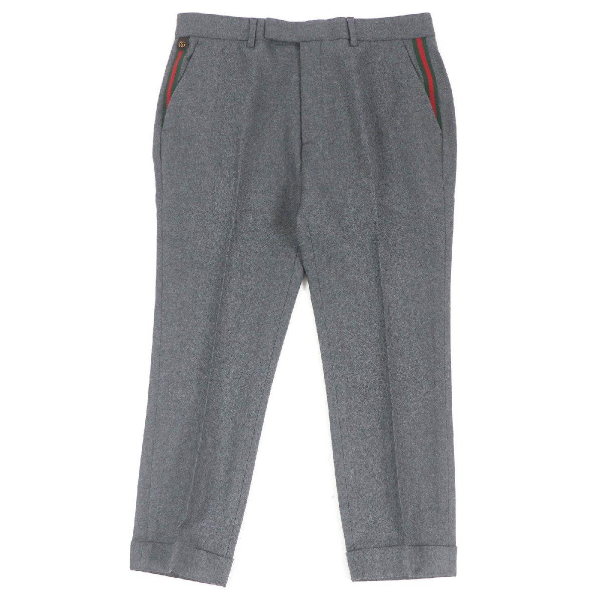 > 美品□GUCCI グッチ 698813 ウール 牛革 ウェブライン GGロゴゴールド金具 ダブル スラックス グレー 50 イタリア製 正規品 メンズ