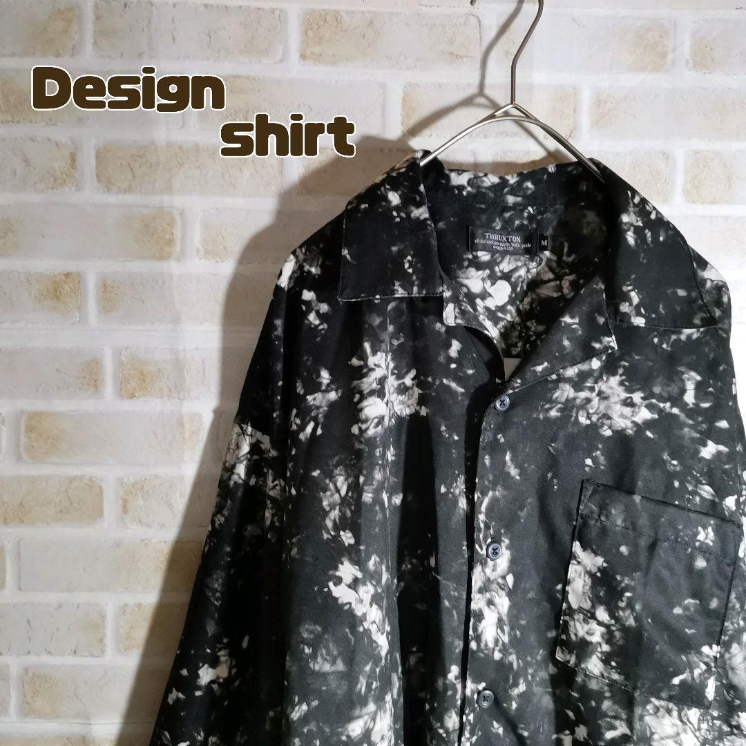 - デザイン シャツ 長袖 総柄 ボタニカル 黒 オープンカラー