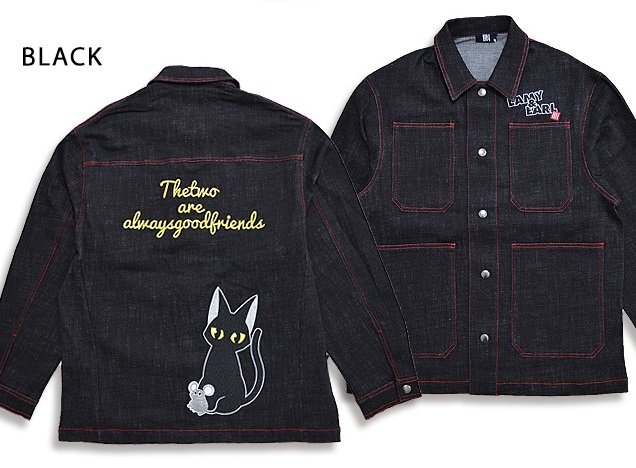 - ラミ&アール デニムカバーオールジャケット◆LIN ブラックXLサイズ AL-75061 黒猫 ネコ 鼠 ネズミ 刺繍