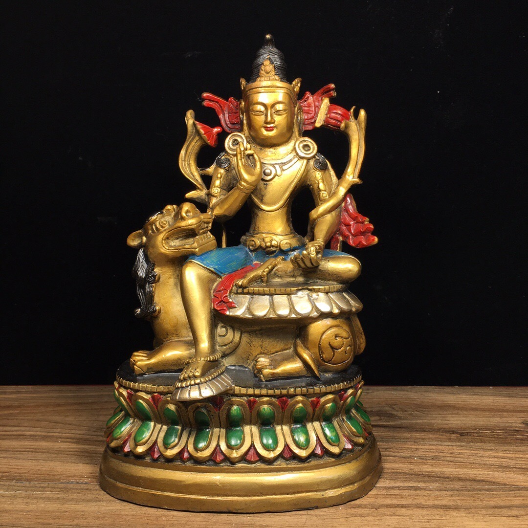 - 【仁】『銅製・金鍍・彩繪・坐神獣觀音像・仏教古美術・供養品』極細工 古賞物 中国古玩 古美術 古美味
