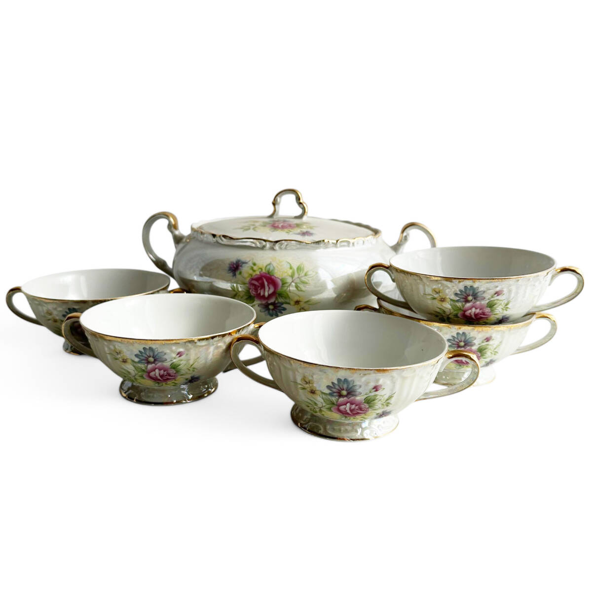 > N7-362 レトロ Fancy 食器まとめ売り スープポット スープカップ 5客 ロココ調 金彩 オーロラ