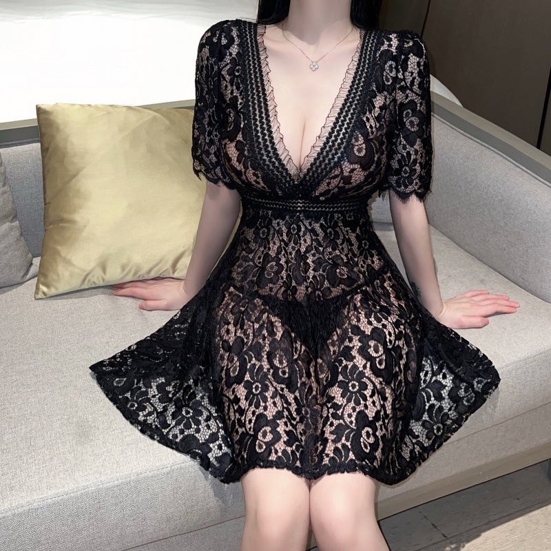 > 超セクシー 総レース シースルー 花柄 総柄 Vネック カシュクール Aライン フレア ワンピース 黒 ドレス結婚式パーティ ブラック