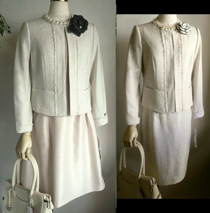 - 新品9号ベージュツイードフリンジノーカラースーツ+ワンピース3点セット入学式フォーマルセレモニー