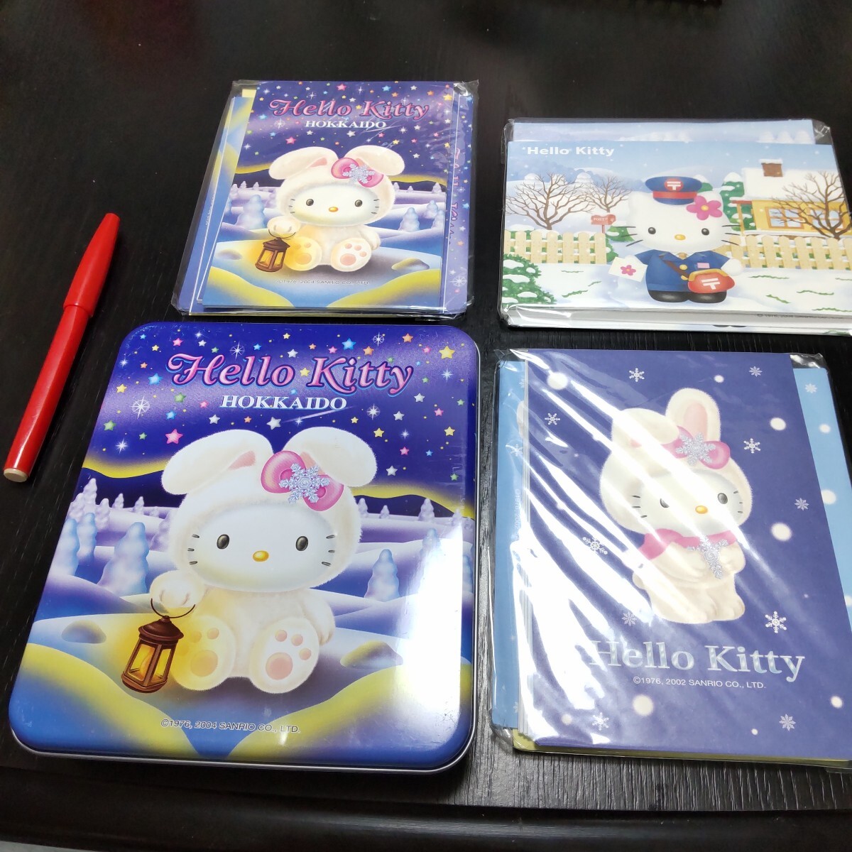 - 2502 サンリオ ハローキティ キティ レターセット3種 封筒&便せん&ポスカ&ステッカー 缶ケース入 白うさぎ 郵便局員 2002/04年 レトロ