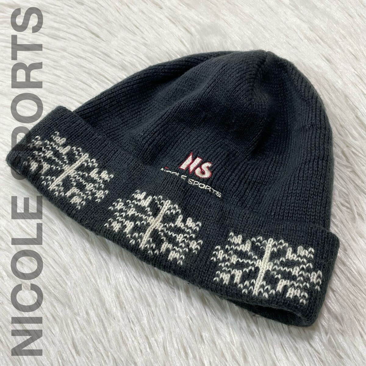 - NICOLE SPORTS ニコル スポーツ ロゴ 刺繍 ノルディック柄 ウール混 ニット帽 帽子 チャコール CP094