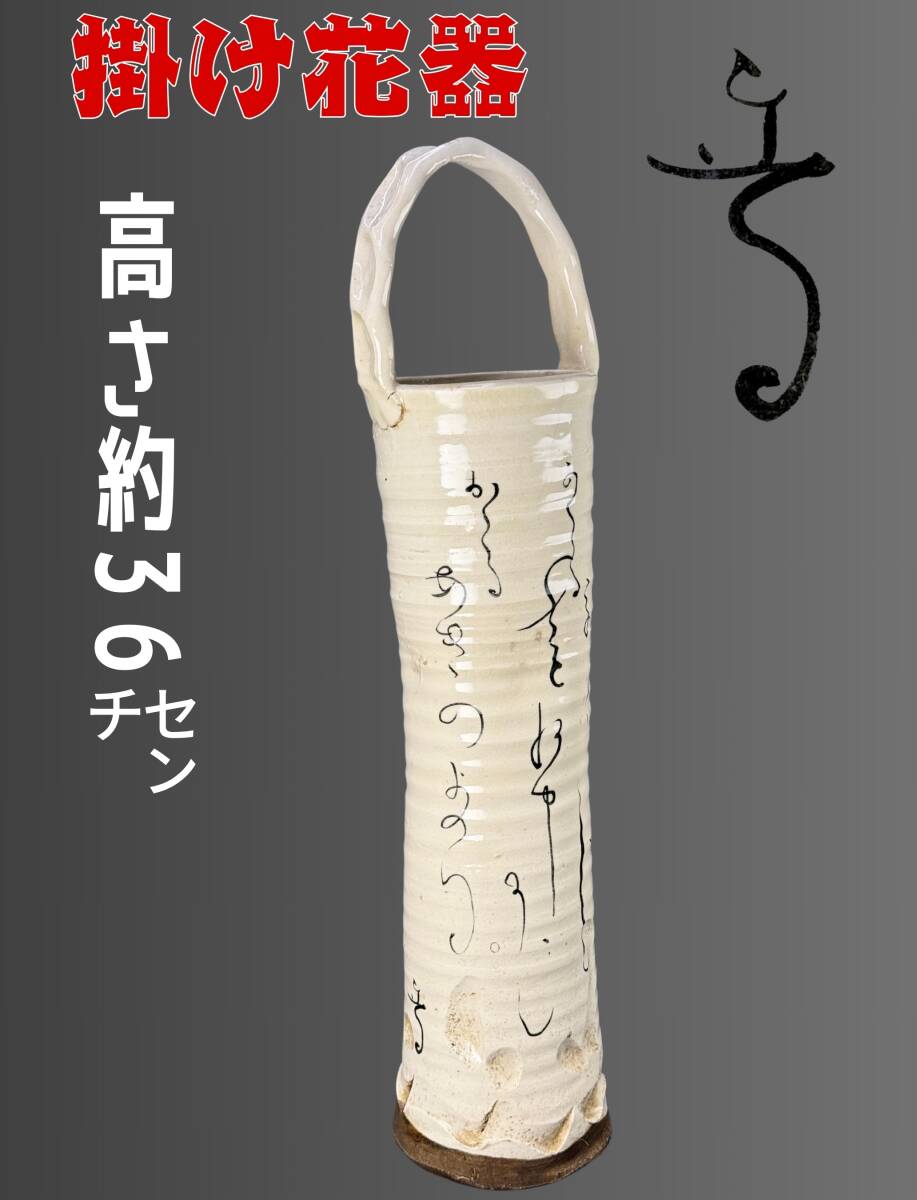 - 【偲】蓮月 掛花瓶 花入 掛け花入れ 花瓶 筒花入 華道 茶道 陶器 陶芸 在銘 わびさび 高さ約36㌢ d-32