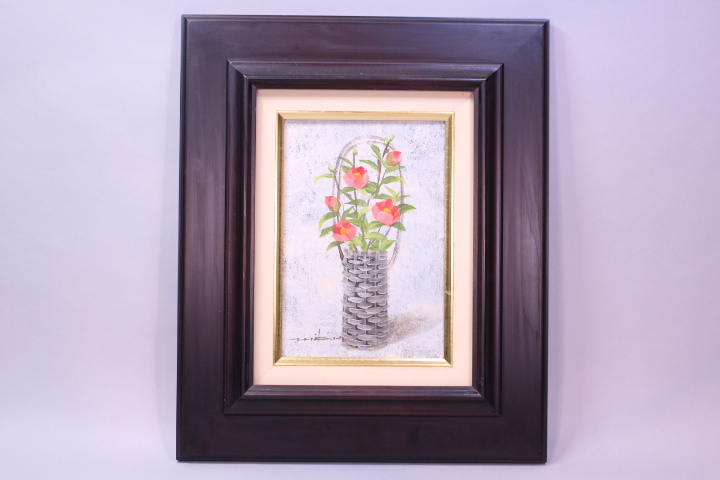 - w-5912 服部美喜 「籠に椿」SM 油彩 真作 額装