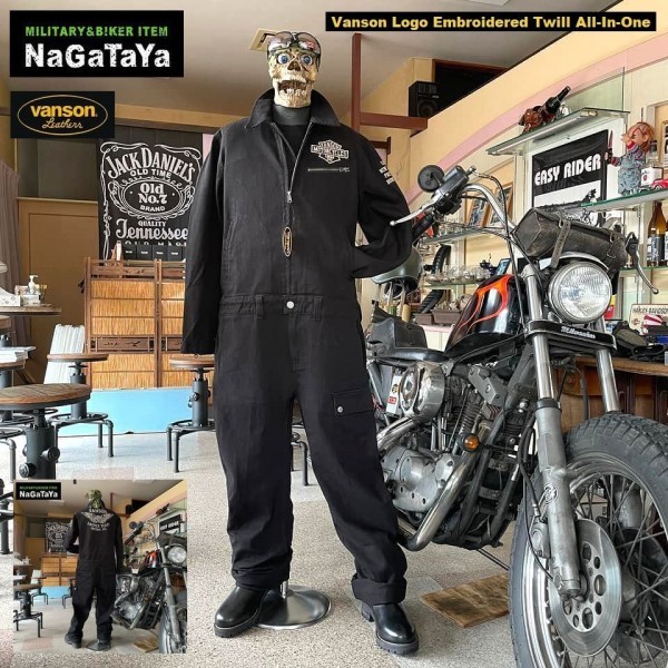 - VANSON バンソン NVAO-403NC フライング ロゴ刺繍 ツイル オールインワン Lサイズ ブラック 黒 つなぎ カバーオール バイカーウェア