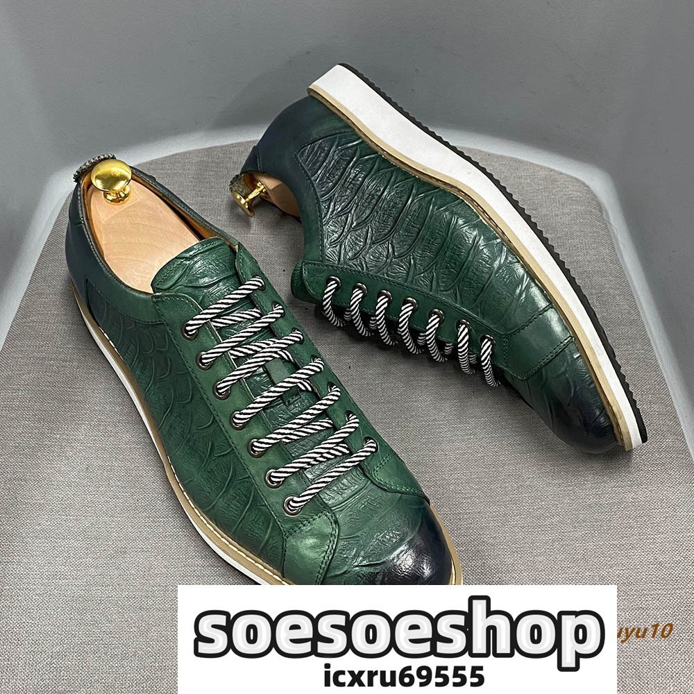 > 定価9万超◆最高級 スニーカー 本革 レザーシューズ メンズ ビジネスシューズ 牛革 革靴 職人手作り紳士靴 軽量ローファー グリーン 27.0cm