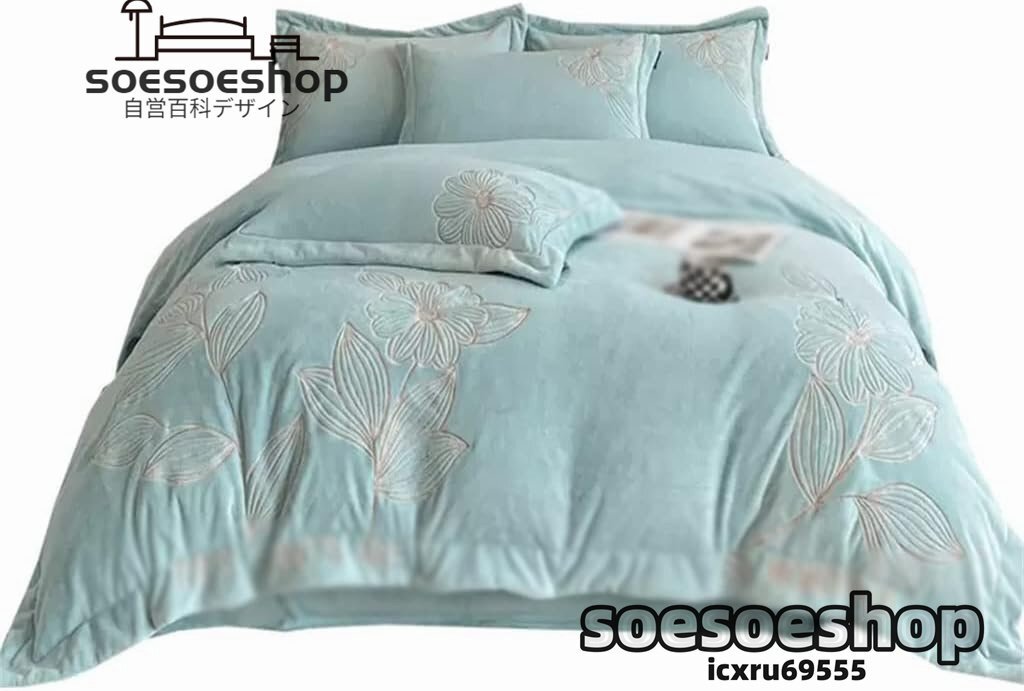> 刺繍暖かい両面ベルベット 4 点セット肥厚フランジ サンゴ ベルベット キルト カバー ベッドカバー寝具 200*230cm