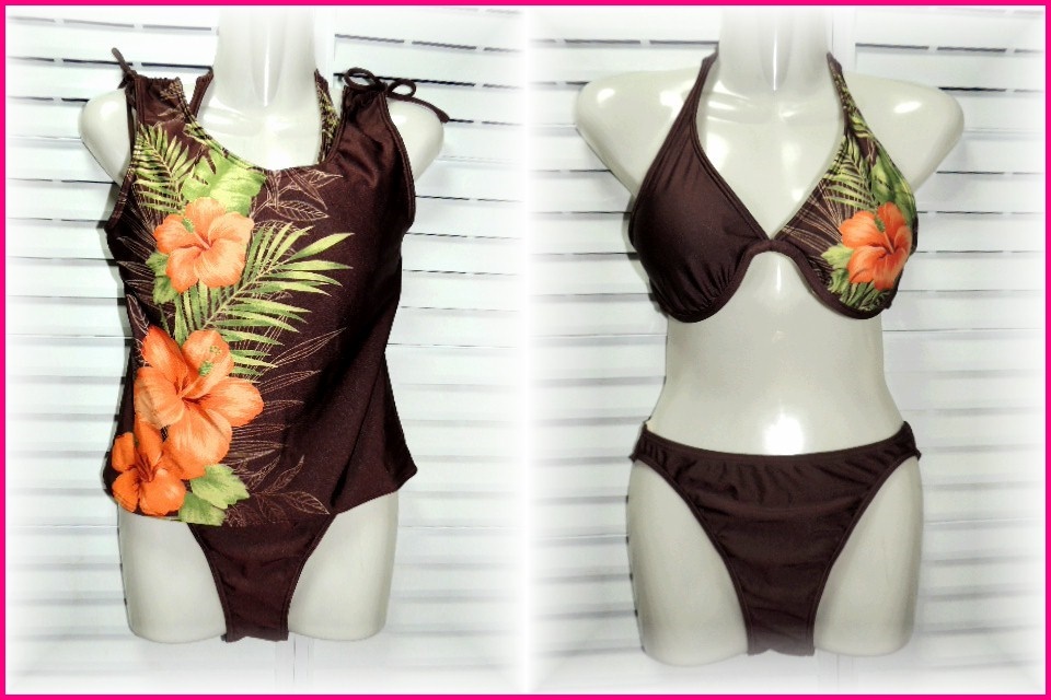 - ヤマトヤ セパレート水着タンキニセット 11号/L 光沢ブラウン×ボタニカル柄