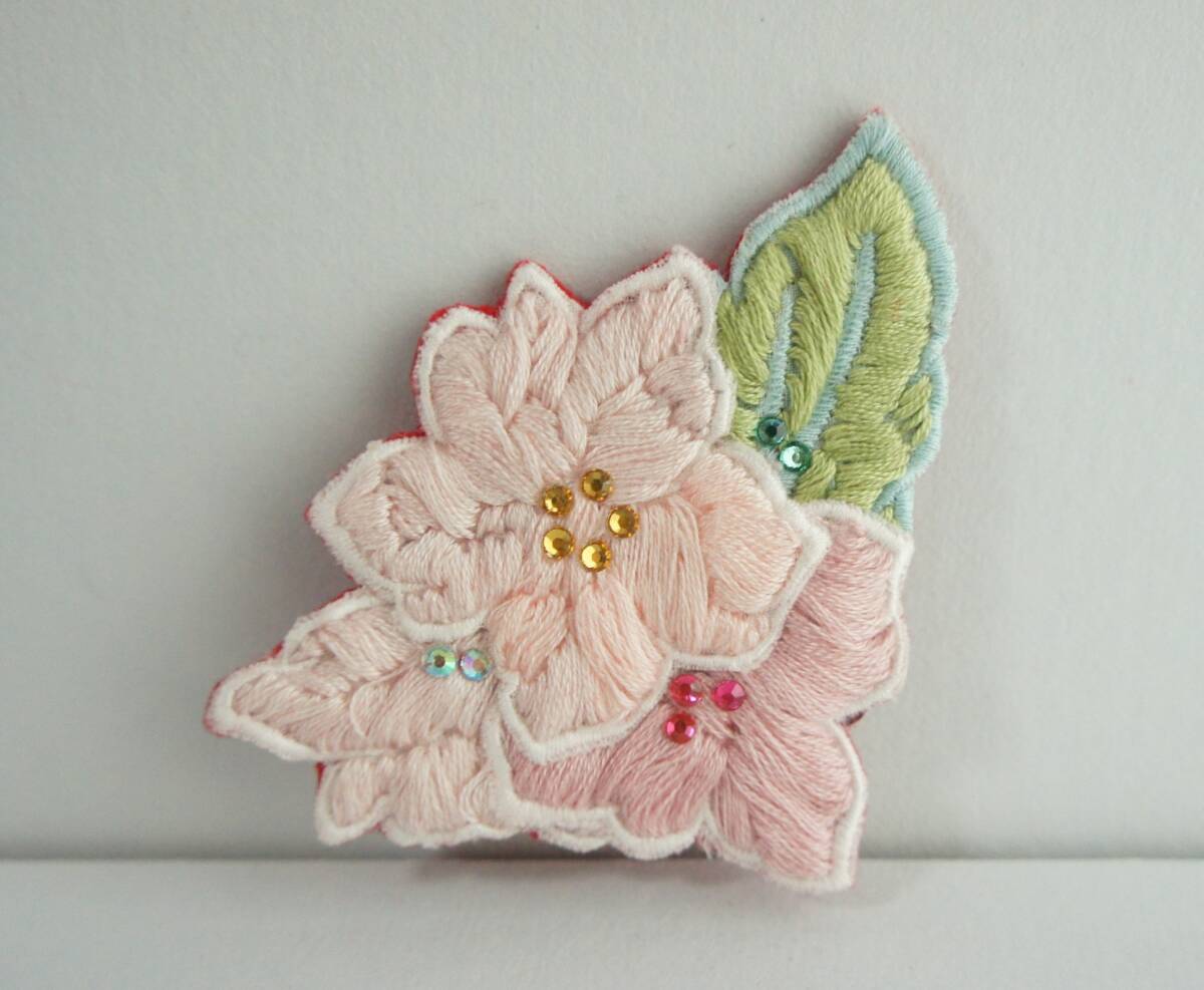 - ♪ ハンドメイド お花 ブローチ レースモチーフに刺繍 刺繍糸 高分子結晶ストーン使用