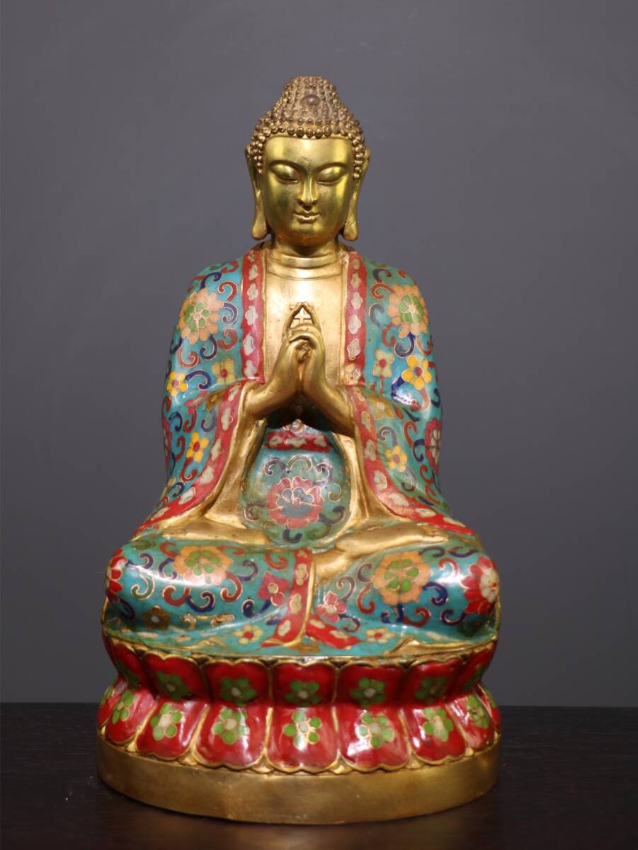 - ▽鴻▽ 銅製 塗金 景泰藍 琺瑯彩 釋迦牟尼像 置物 古賞物 中国古玩 中国古美術